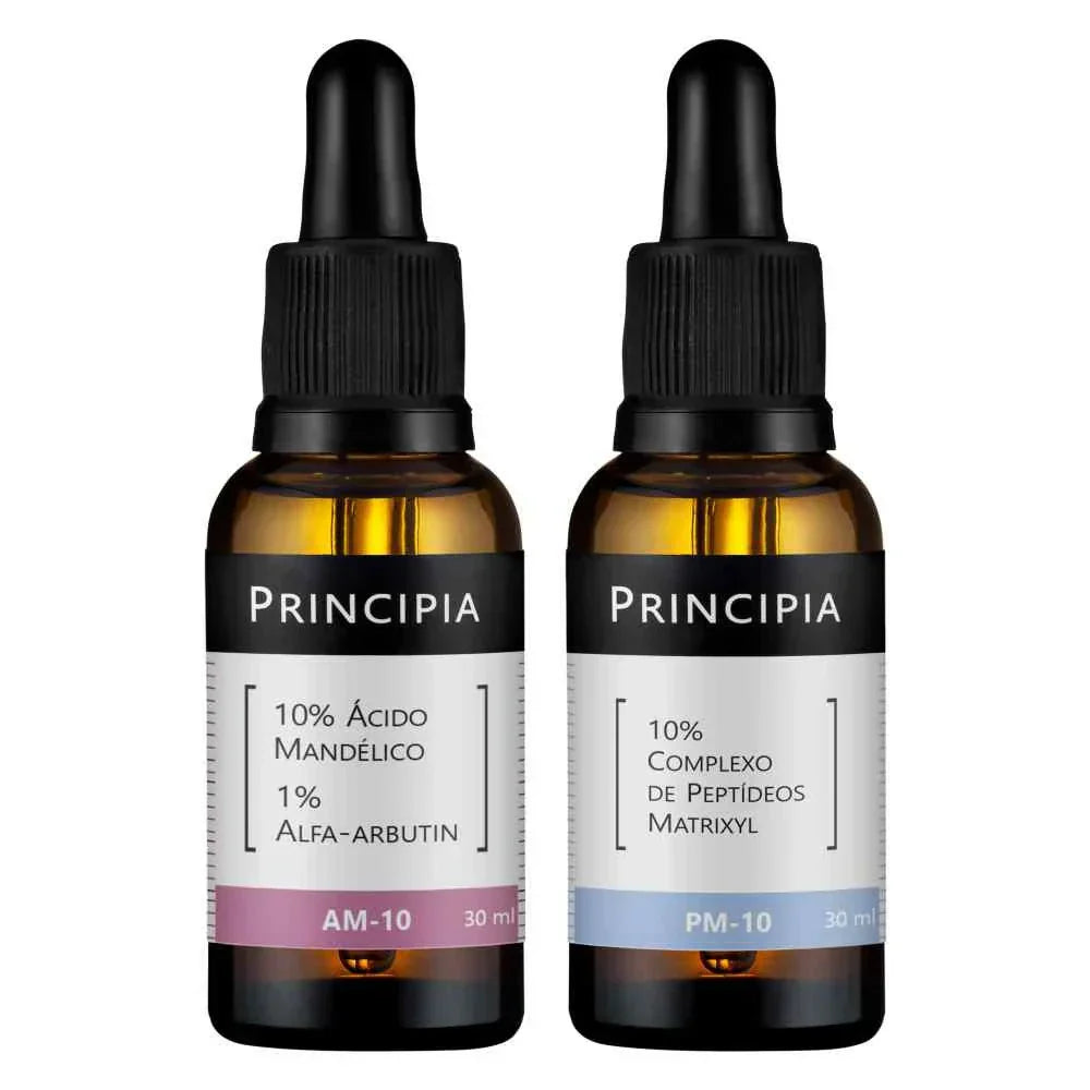 Kit com um sérum com 10% de Ácido Mandélico + 1% de Alfa-arbutin e um sérum com 10% de Peptídeos Matrixyl, para uma rotina com alta eficácia contra rugas, manchas, cravos, acnes e oleosidade.