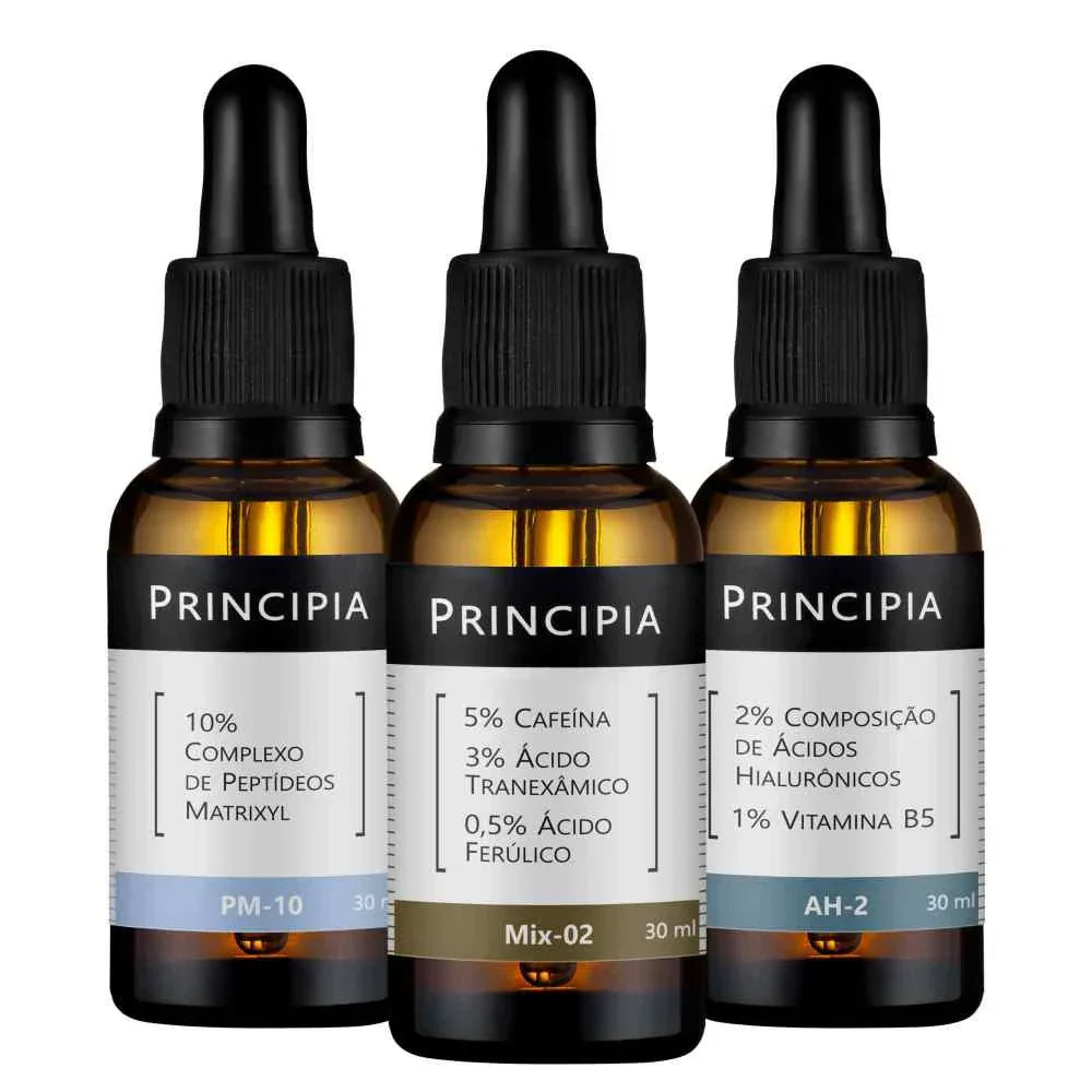 Kit com um sérum 10% Peptídeos Matrixyl, um sérum 2% Ácidos Hialurônicos e um sérum Mix-02, em caixa de presente.
