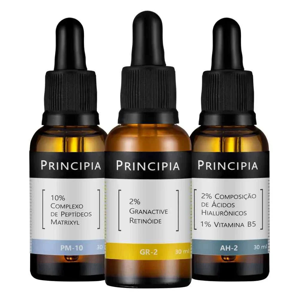 Kit com três fórmulas: uma emulsão com Granactive Retinóide, um sérum com Peptídeos Matrixyl e um sérum com Ácidos Hialurônicos + Vitamina B5, em caixa de presente.