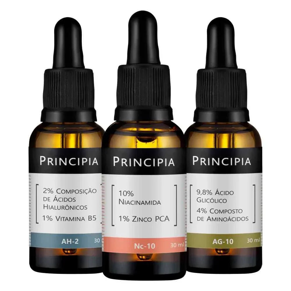 Kit com um sérum com 10% de Niacinamida + Zinco PCA, um sérum com 9,8% de Ácido Glicólico + Aminoácidos e um sérum com 2% de composição de Ácidos Hialurônicos, em caixa de presente.