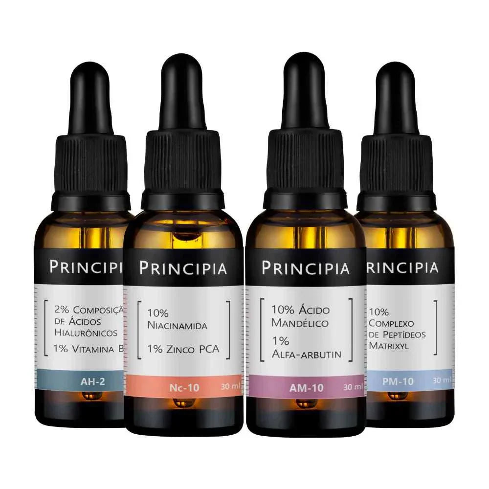 Kit com um sérum de Niacinamida + Zinco, um sérum com Ácido Mandélico + Alfa-arbutin, um sérum com Peptídeos Matrixyl e um sérum com Ácidos Hialurônicos.