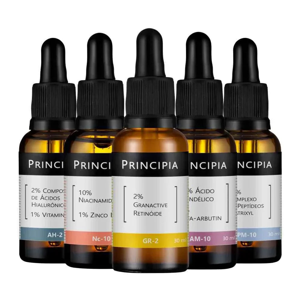 Kit com 5 fórmulas: Granactive Retinóide, Niacinamida + Zinco, Ácido Mandélico + Alfa-arbutin, Peptídeos Matrixyl e Ácidos Hialurônicos.