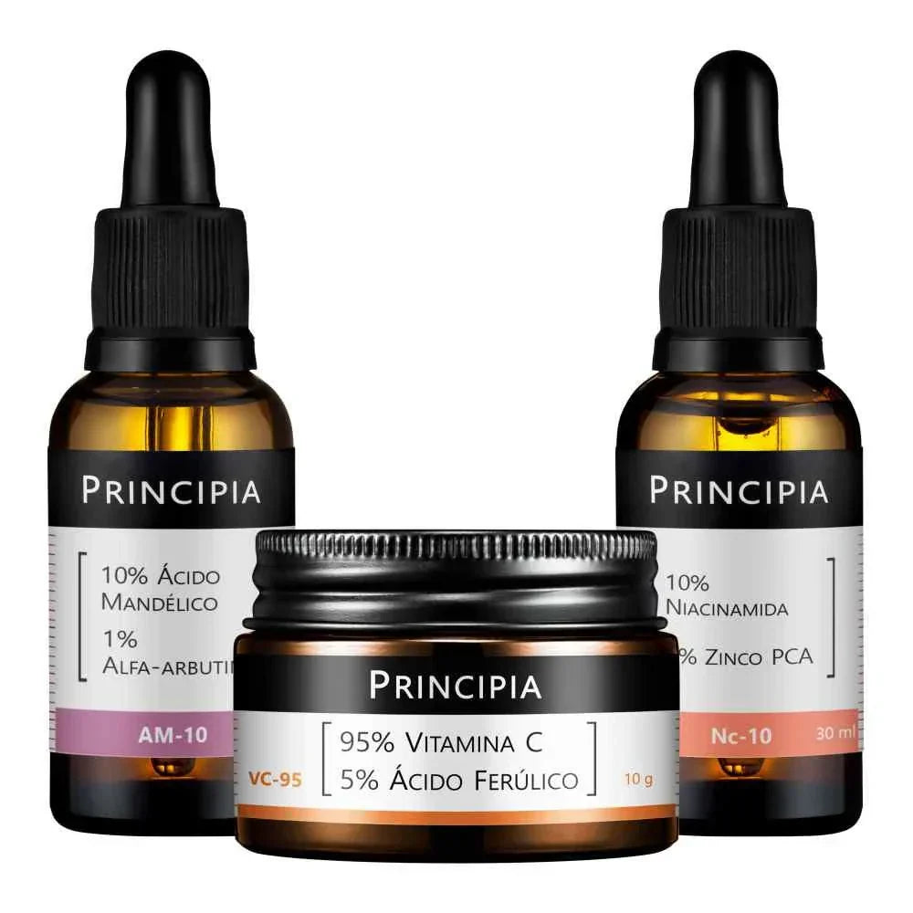 Kit com uma fórmula em pó com 95% de Vitamina C Pura + Ácido Ferúlico, um sérum com 10% de Niacinamida e um sérum com 10% de Ácido Mandélico + Alfa-arbutin, em caixa de presente.