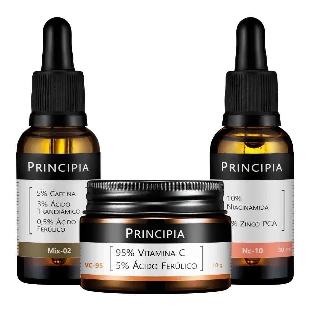 Kit com uma fórmula em pó com 95% de Vitamina C Pura + Ácido Ferúlico, um sérum com 10% de Niacinamida + Zinco e um sérum com 5% de Cafeína + Ácido Tranexâmico, em caixa de presente.
