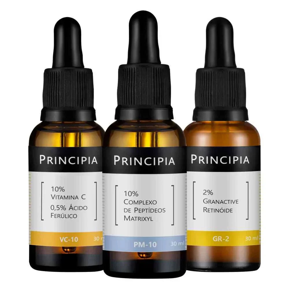 Kit com três séruns com alta eficácia antissinais comprovada clinicamente: um com Peptídeos Matrixyl, um com Granactive Retinóide e um com Vitamina C + Ácido Ferúlico, em caixa de presente.